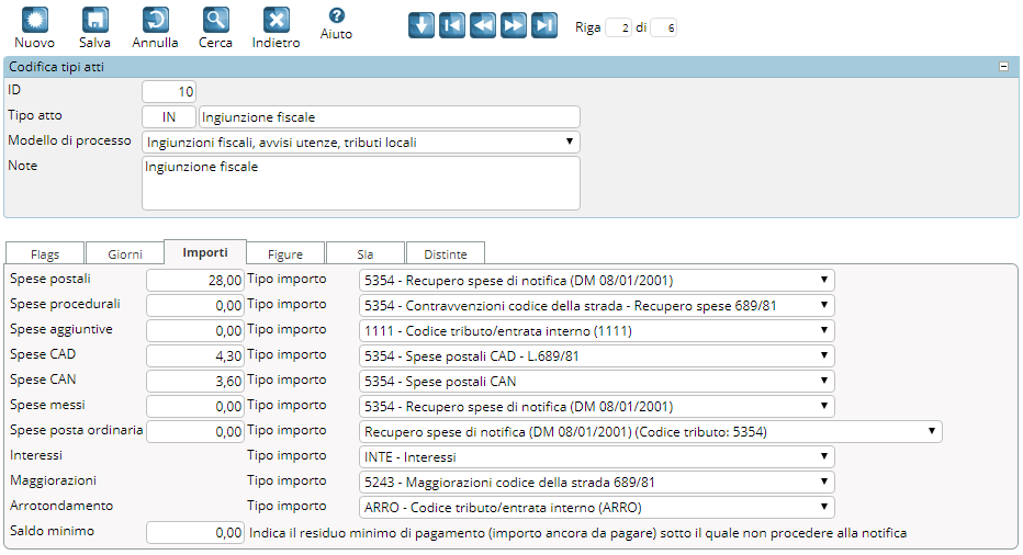 La scheda “Tipi atto” disponibile nel menu Parametri consente la gestione delle tipologie di atto per le quali gestire l'iter di riscossione.