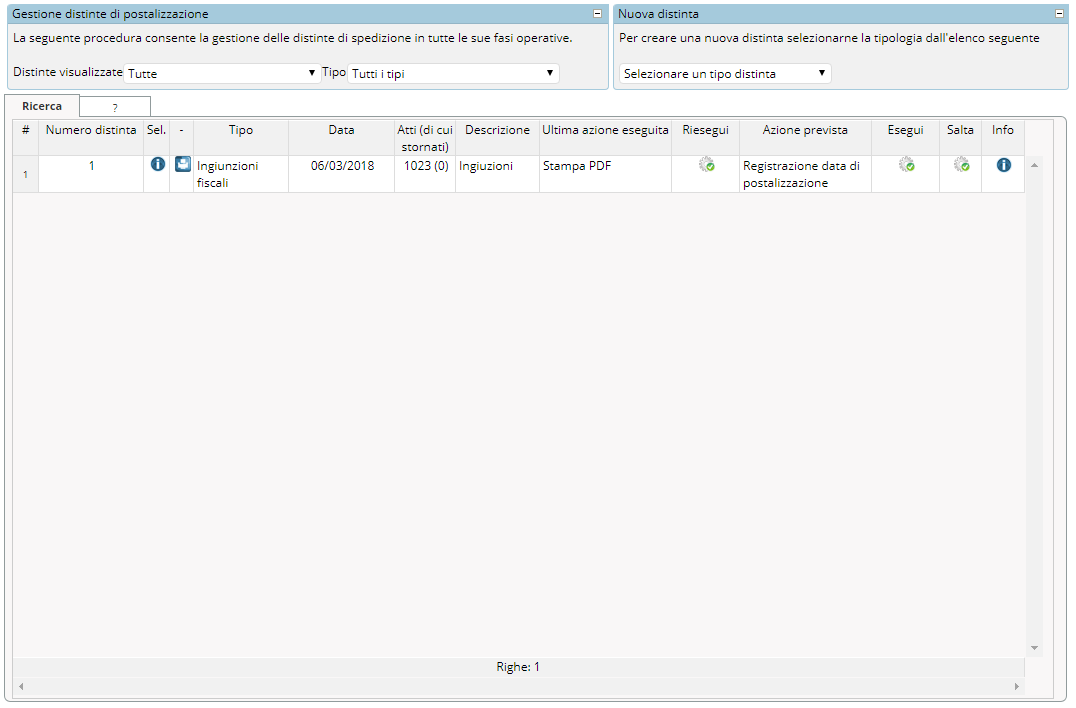| Info | Visualizza un riepilogo degli atti contenuti in distinta evidenziandone la posizione (pagamenti, raccomandate attribuite, parifiche) |